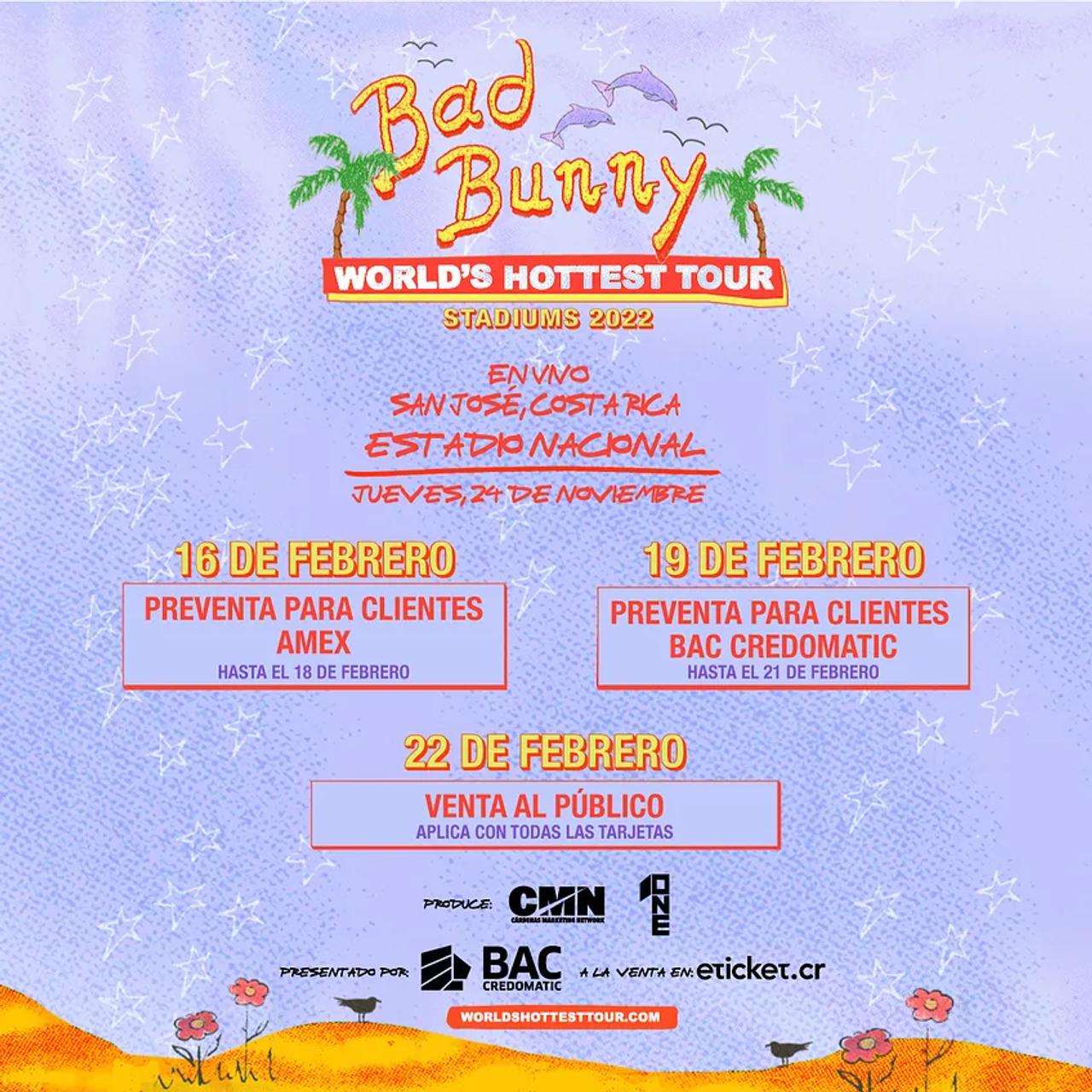 En esa misma página venderán este 16 de febrero las entradas para ver a Bad Bunny en el Estadio Nacional de Costa Rica el 24 de noviembre, una fecha casi igual a cuando nos visitó en el 2018.