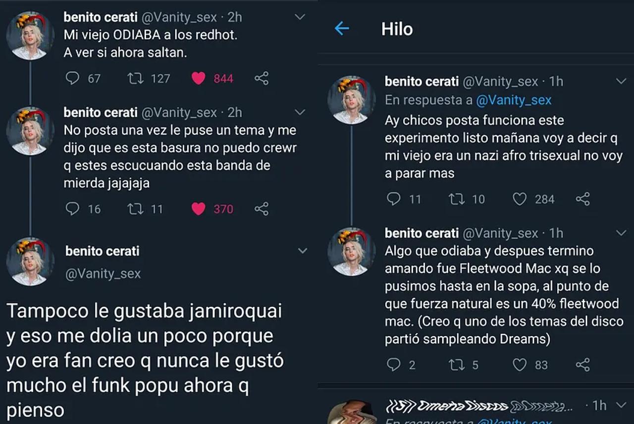No contento con eso Benito dijo que el papá también odiaba Jamiroquai y Fleetwood Mac. Pero ojo, dice que a Cerati lo expusieron tanto a la voz de Stevie Nicks que el disco Fuerza Natural (el último disco que Cerati grabó) estuvo muy inspirado por Fleetwood Mac. Luego borró todos los tuits porque eso es lo que uno hace cuando lo atacan cientos de boomers de toda Latinoamérica solo por decir que Cerati tenía gustos diferentes. Ok.