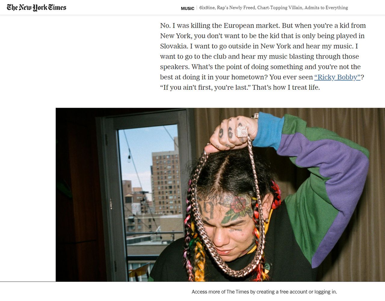 En un punto el entrevistador, Joe Coscarelli, le pregunta que si tiene miedo a morirse y 6ix9ine le contesta “FUCK YEAH, UD NO?!”. Coscarelli le responde como “creo que usted está más cerca de la muerte que yo”. Es una entrevista brutal y básicamente me reafirmó que entrevistar porque es una forma de cuestionar el personaje que se han creado las celebridades. Coscarelli por ejemplo le pregunta por qué usa the N-word siendo él latino o porqué su música es tan monótona. Todo con palabras más elegantes, obvio.